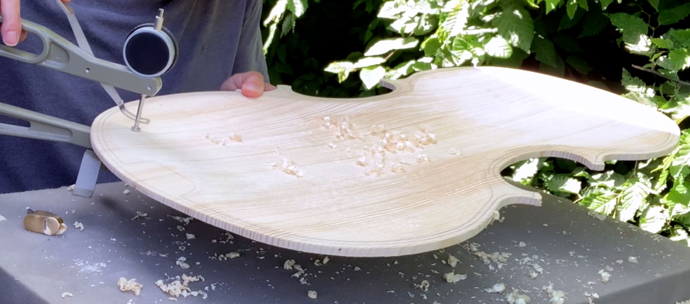 Beschreibung: Wann immer es das Wetter zulässt, verlege ich meine Werkstatt nach draußen und arbeite in der Natur, dort, wo das Holz in seiner natürlichen Umgebung ist. Die Decke von op. 4 wurde aus etwa 20 Jahre gelagerten Klanghölzern einer Bergfichte mit einer Dichte von 0,4 g/cm³ (8 % FG) und relativ breiten, aber regelmäßigen Jahresringen gefertigt. Am rechten oberen Rand befindet sich eine optisch interessante, schmale Wachstumsstörung, die vermutlich durch einen Ast verursacht wurde. Die Zargen und der Boden bestehen aus sehr gleichmäßigem und schön geflammtem Bergahorn. Der Öl-Lack mit intensiven rot-braun Pigmenten verleiht op. 4 einen warmen, historisch anmutenden Glanz.