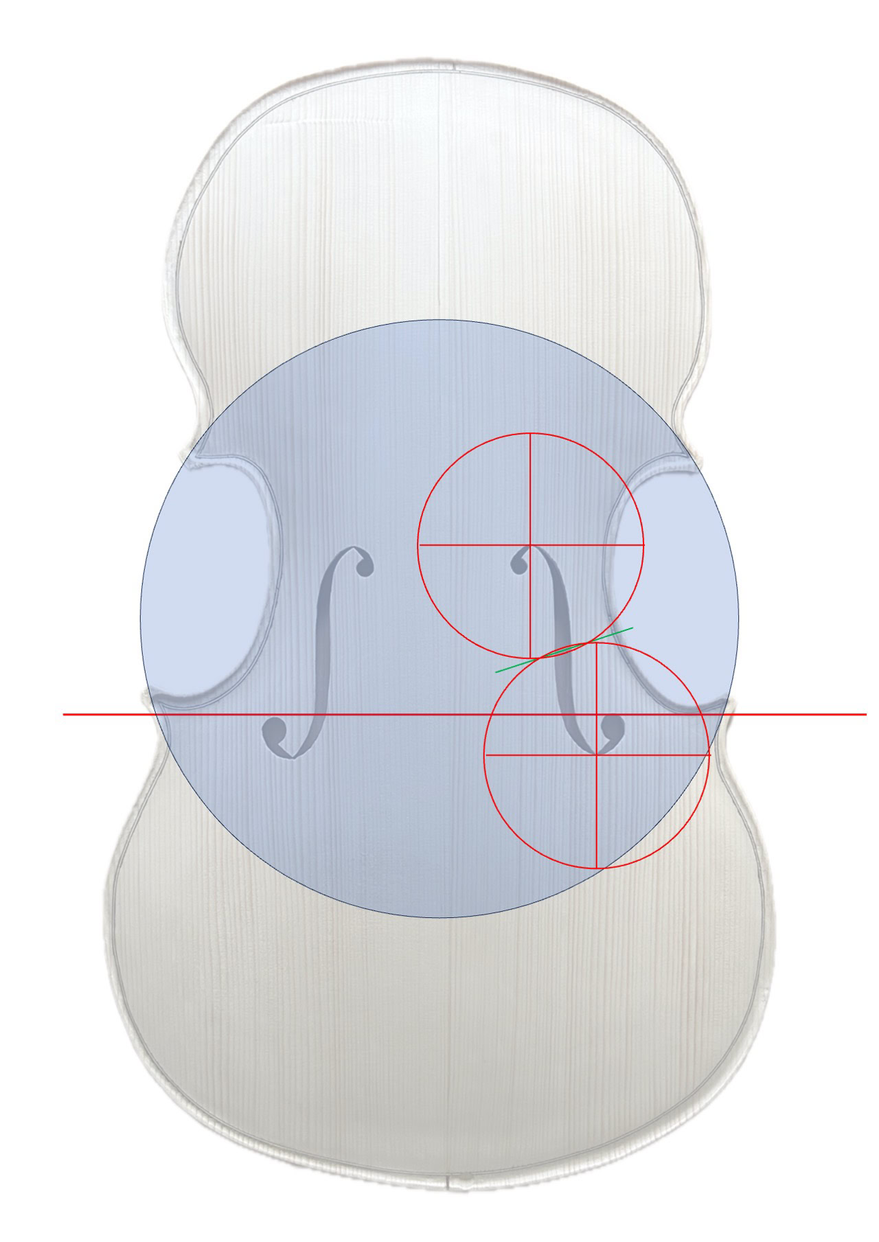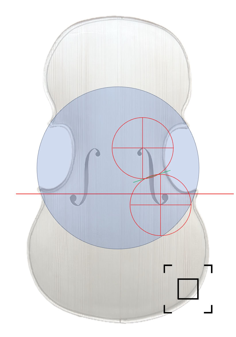 On many historical celli, the corner joints lie on a circle around the centre (Z) of the axis of symmetry. The inner distance between the upper f-hole eyes should be between 90-92 mm, but in any case should be the width of the bridge feet. The notches lie on a line through the intersections of two circles, the centres of which are at the top and bottom edges of the f-holes. The centre line of the notches is 400 mm from the top edge. The top edges of the lower f-hole eyes should lie below a line through the lower corner junctions (Hargrave, 1987; King, 2004; Lardon, 2020).